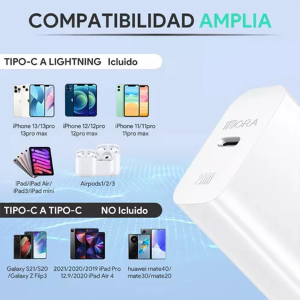 Incluye cable Lightning a Tipo C, ideal para dispositivos Apple compatibles, reduciendo significativamente el tiempo de carga frente a cargadores convencionales.
